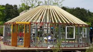 Structure is built from steel framing with wooden roof. Yurt is three layers ,waterproof canvas choice of colors and patterns , wool-felt insulation and silk under wood lattice walls inside . Handcrafted dome-work with choice of patterns . Skylight, clients can choose style. Many features available .Our team of experts will guide you,
